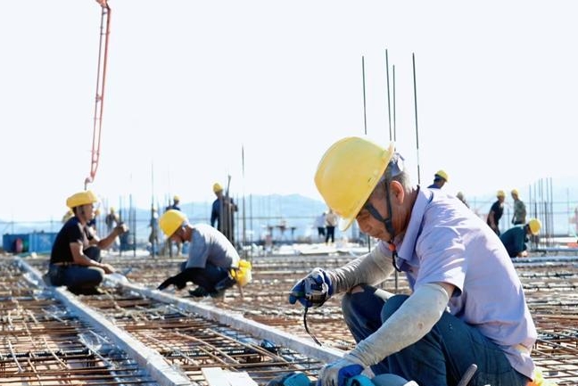 在福州(连江)国家远洋渔业基地的达诚水产品加工与配送中心项目施工现场,塔吊林立,工程车辆往来穿梭,百余名工人分布在不同作业区,有条不紊地进行钢筋绑扎、水泥浇筑、室内砌筑等工作。