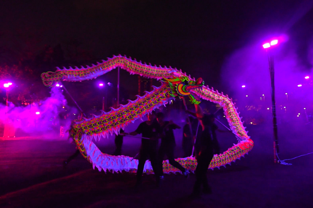 火焰跃动,夜光舞龙,表演助兴令游客流连忘返。月光如水,洒在每一个幸福欢笑的脸上,呈现出一派繁华热闹景象。