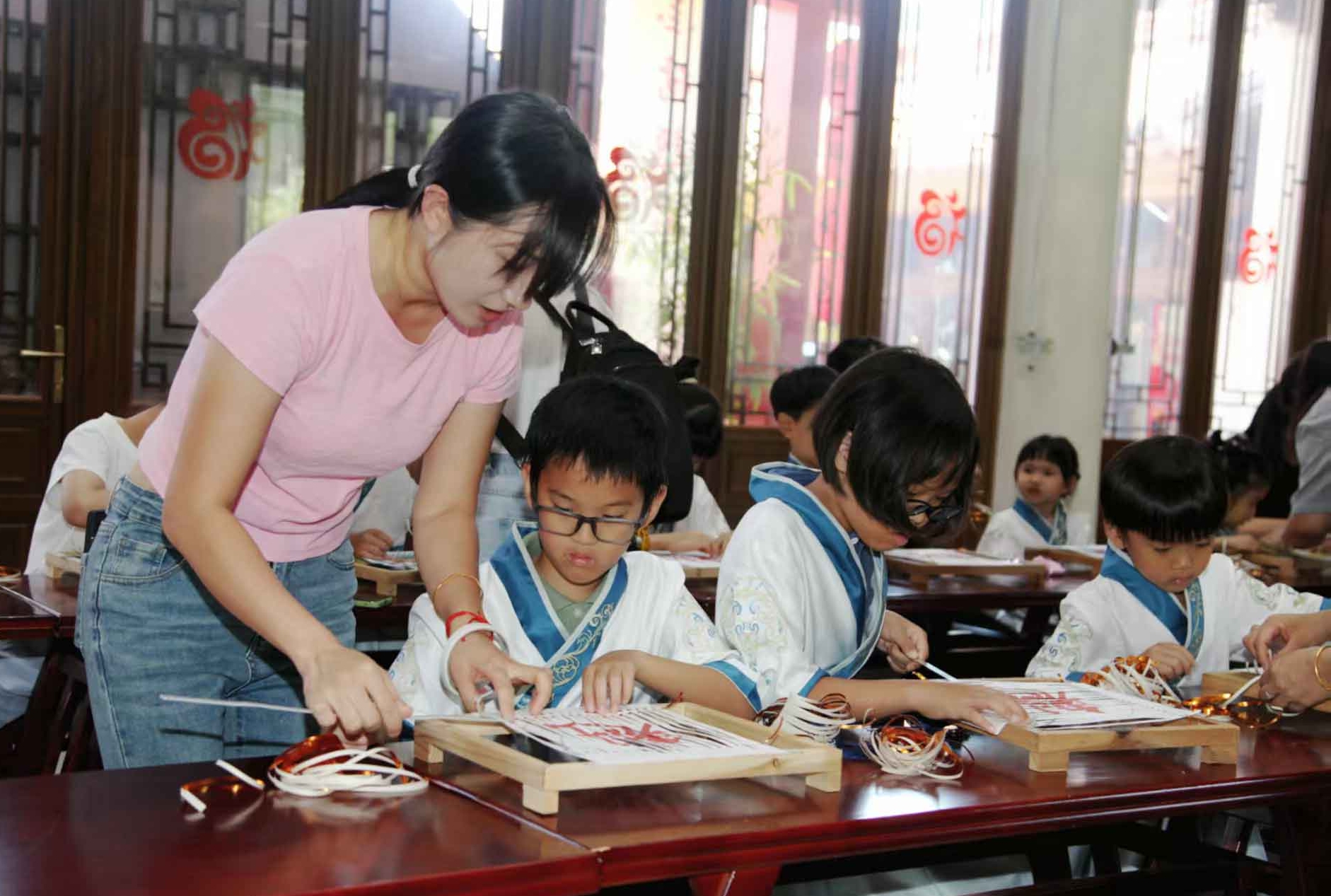 两岸儿童非遗文化交流活动同期举行,十几位两岸学生同时进行非遗技艺学习,在永春县纸织画传承人的指导下,学生们聚精会神地学习纸织画的制作,来自金门金湖小学的简琞天和简梵地是一对双胞胎,他们在制作纸织画时,指尖轻挑纸丝,望着逐渐显现的朦胧画境,被永春纸织画特殊的美感迷住了。