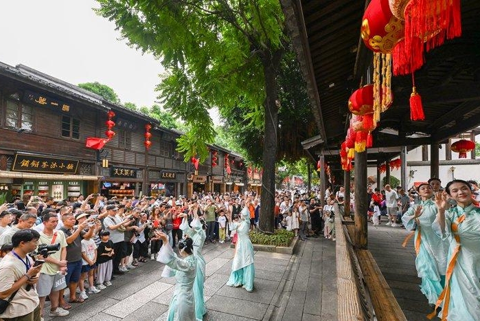 三条簪表演亮相三坊七巷,吸引市民游客纷纷驻足拍照。记者 池远 摄