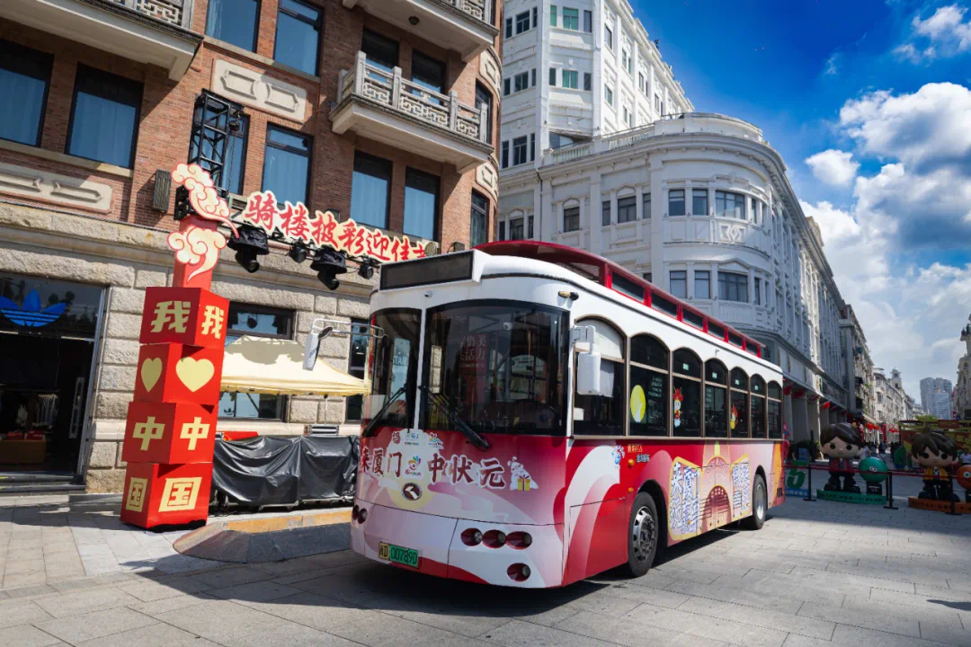 在鹭江宾馆旁,装扮一新的嘉年华铛铛车整装待发。(厦门文旅 供图)