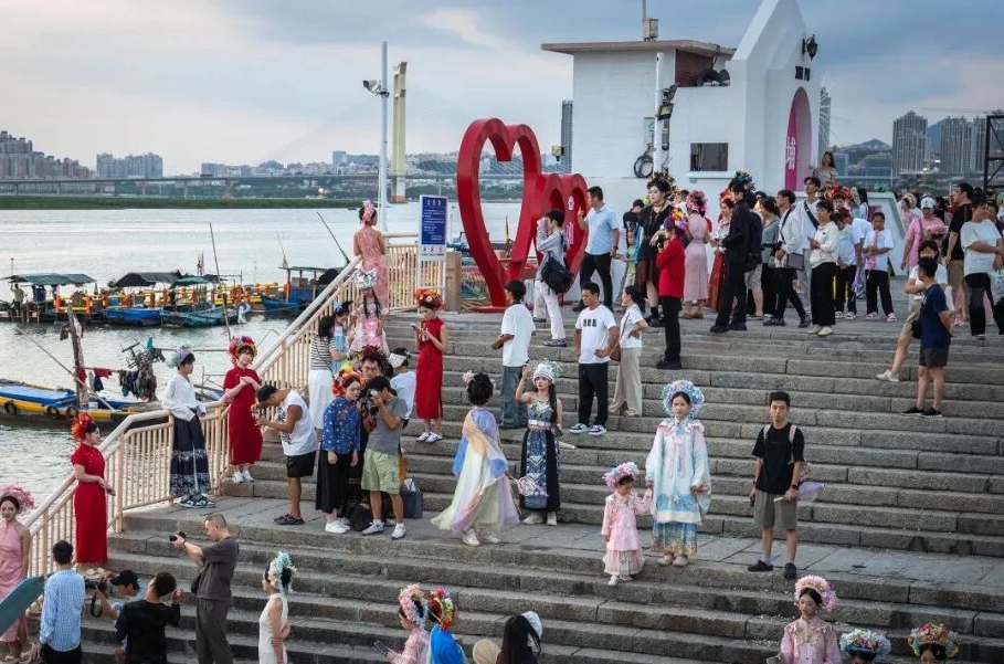 国庆假期期间,簪花比平日更受追捧。傍晚时分,余晖浸染晋江水,丰泽蟳埔码头变身露天影棚,八方游客头戴簪花围,身着华服,在温柔暮色中定格簪花浪漫。(陈起拓 摄)