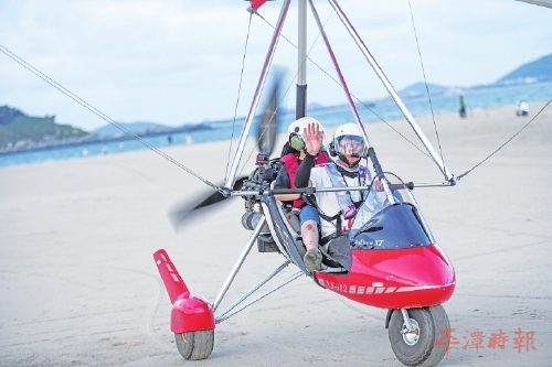 在龙王头沙滩,动力三角翼低空飞行项目成为空中观景的亮点。随着螺旋桨的轰鸣声划破长空,一架架三角翼载着游客腾空而起,翱翔于碧海蓝天之间。游客俯瞰脚下蜿蜒的海岸线与层层涌动的浪花,尽享“海天一体”的视觉震撼。“从空中看平潭真的太不一样了,海水像蓝宝石一样,海岸线弯弯曲曲,那种开阔和自由,站在地面上是感受不到的!”刚结束飞行的游客宋先生激动地说。