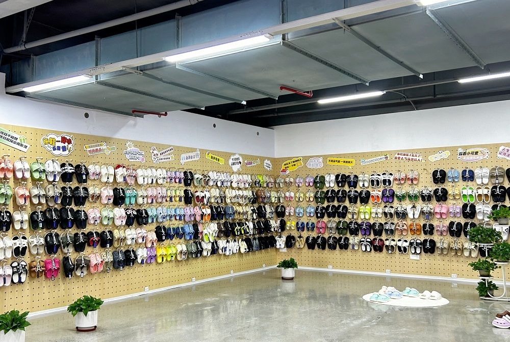位于福建嘉怡新材料科技有限公司内的晋江市拖鞋选品中心,目前已有50多家拖鞋企业入驻。各式各样的拖鞋挂满了展示架,琳琅满目。除了拖鞋,还有拖鞋相关的延伸产品,如拖鞋鞋面挂饰、手机挂件及包袋等产品。