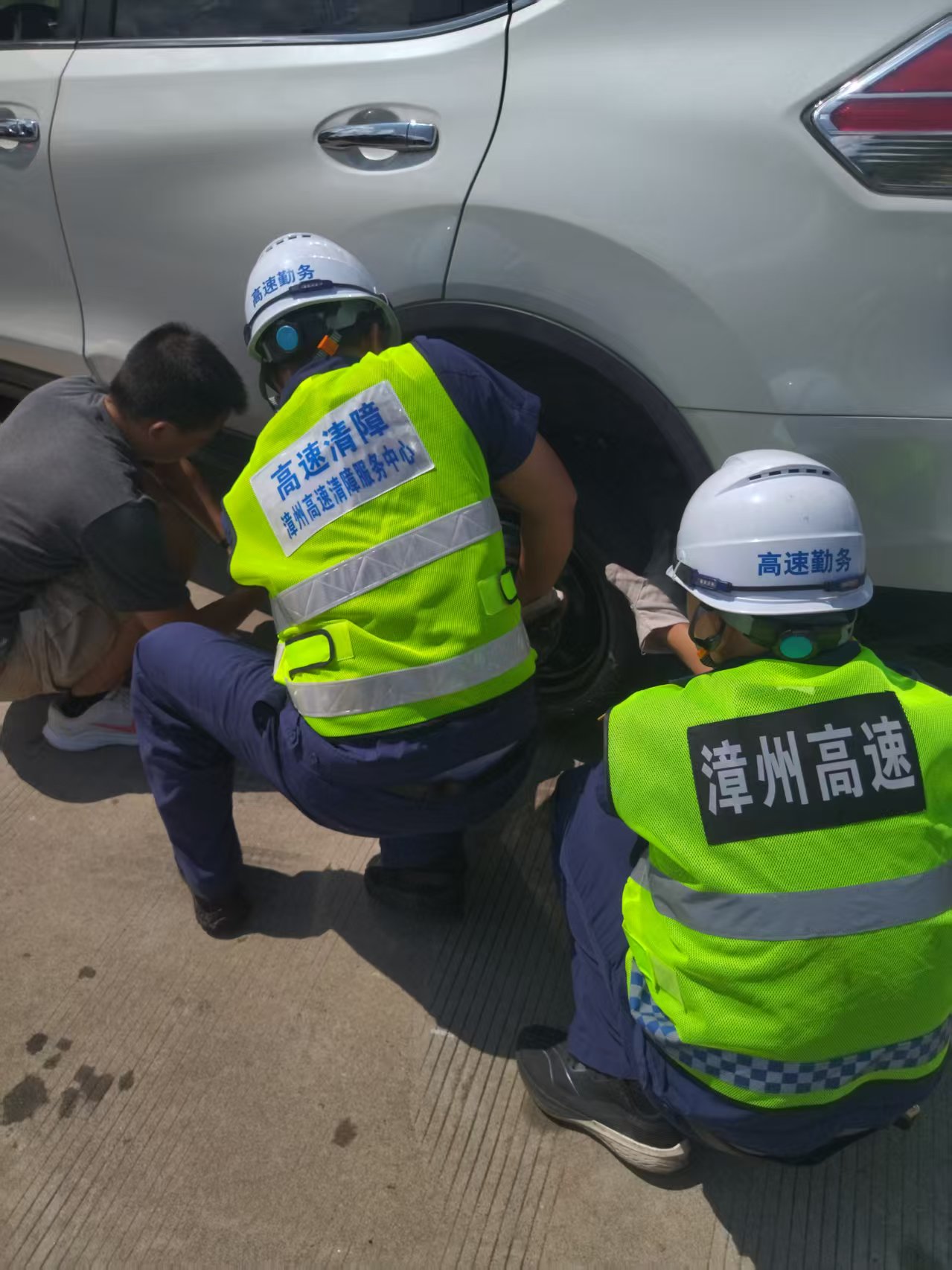经了解,原来司机张先生一家三口从三明要到厦门探亲,返程回家途经事发路段时轮胎出现了故障,由于对车辆构造不熟悉,不知道怎么处置,却刚好碰上了巡逻的路勤员。在天柱山收费站外广场,了解完缘由的小林积极安抚张先生一家的焦虑情绪,随后提起工具箱协助张先生更换备胎,娴熟的动作,一扳一扭。经过十几分钟抢修,备胎很快更换完毕。看着换好的备胎,张先生顿时松了一口气。