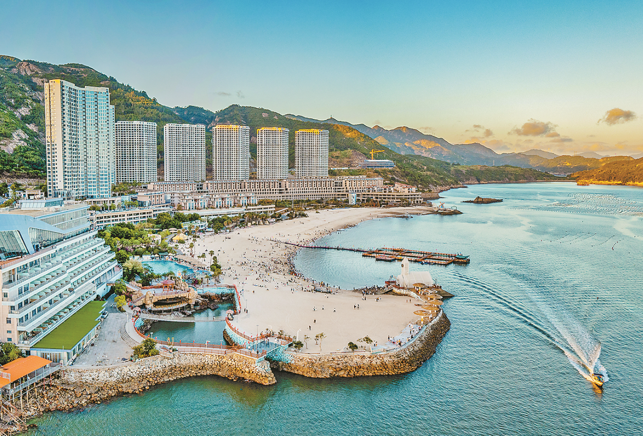 登上“巨轮”观景台,海湾尽收眼底。海岸蜿蜒,人潮涌动。细软白沙亲吻着脚趾,孩子们卷起裤管,奔跑、铲沙。观景台上、棕榈树下、游泳池边,人们玩水嬉戏,留影记游。