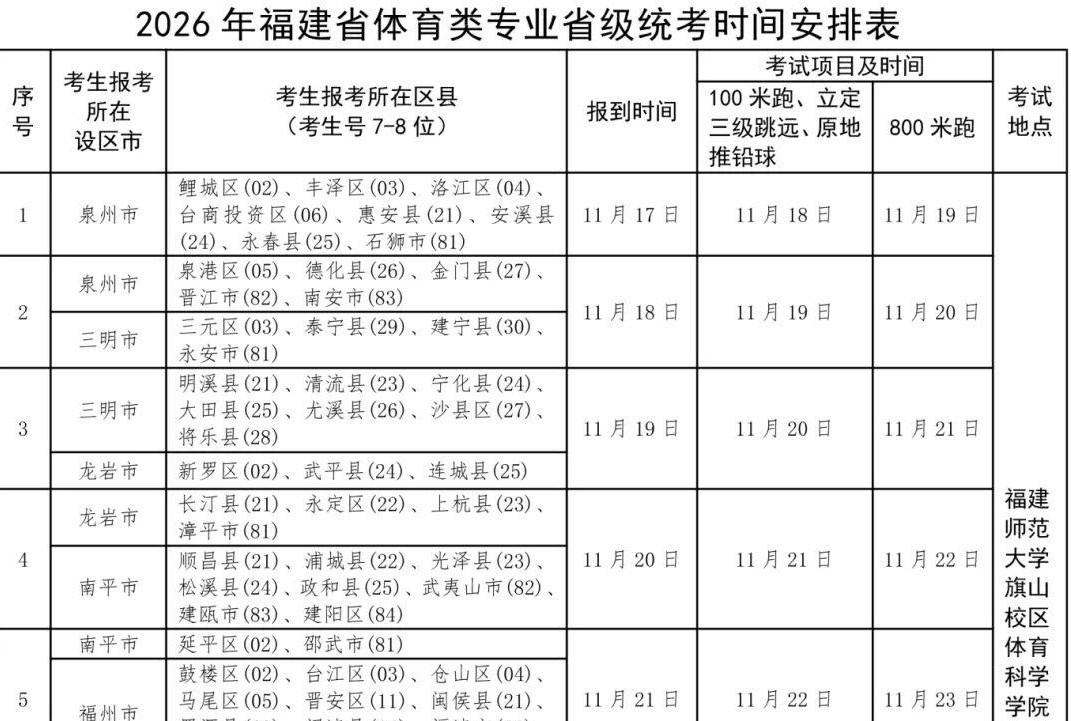 日前,省教育厅印发《关于做好2026年普通高校招生体育类专业省级统一考试工作的通知》,明确2026年福建省普通高校招生体育类专业省级统一考试(以下简称体育类专业省级统考)将于2025年11月17日—11月26日进行。