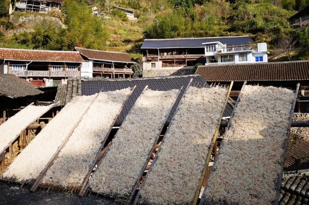 制作番薯米讲究赶早。开工越早,不仅产量高,而且能充分利用日照,番薯米也更容易晒透。人们小心地把番薯丝扬撒在簟子上,刚出水的番薯丝在曙光中白亮晶莹,一片连一片,铺满整个晒场。