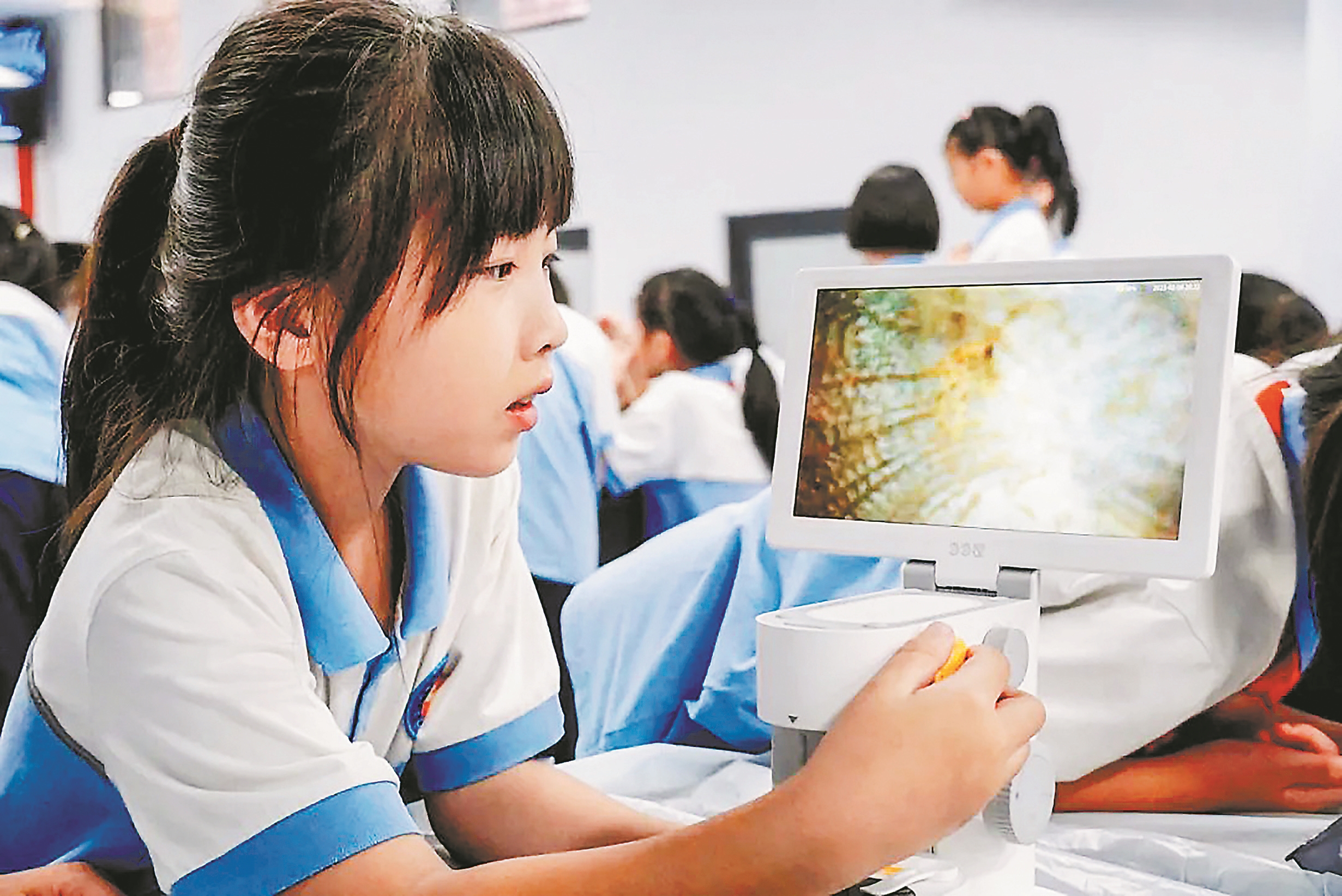 学生通过显微镜观察鱼鳞。