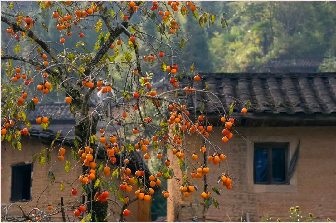 满树红柿与黄墙黛瓦的古村落