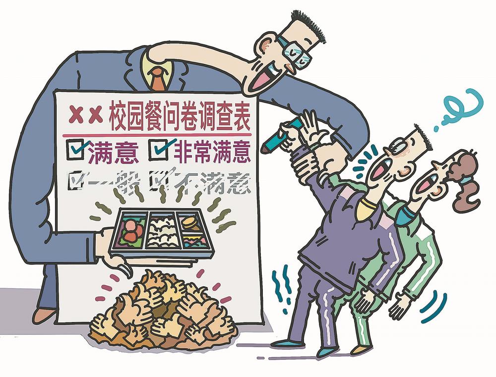 10月14日,辽宁鞍山铁西区实验学校有教师被指在《校园餐学生满意度问卷调查表》填写过程中,要求学生将选了一般和不满意的用橡皮擦都擦掉,只能选择满意或非常满意。对此,10月16日,铁西区教育局发布情况说明称,区委、区政府立即责成区纪委、区教育局等部门组成联合调查组,全面核实处理此事。学校供餐关系学生健康,也关联学校、餐饮供应商等多方利益,监督、评价不能自说自话。对此,需要补上执法监管与外部监督内嵌的短板,畅通家长、学生行使知情权、话语权的渠道。