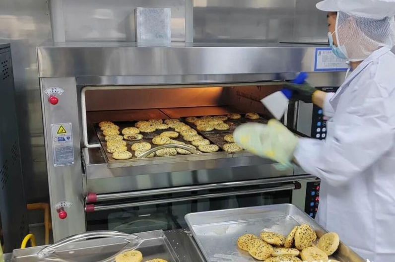 走进永泰葱饼基地,记者看到智能化生产线有序运转,全自动和面机精准配比原料,揉出细腻面团,真空拌馅机将葱花、肉末与调料充分搅匀,定量注入压好的面皮中,包馅机械臂快速完成包裹捏合,一个个生饼坯被整齐送入巨型烤箱。