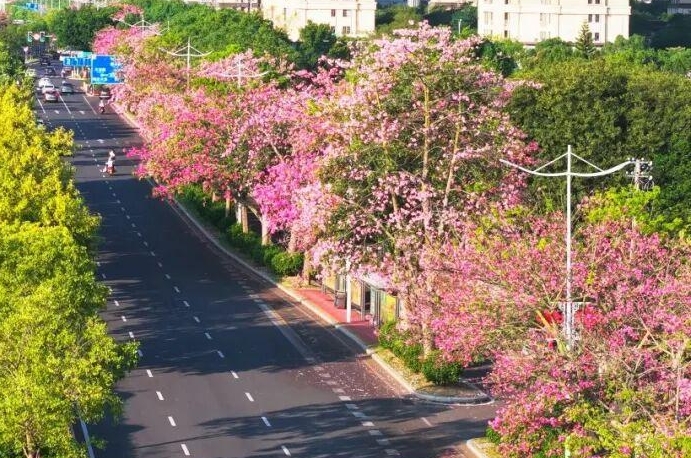 2.迎宾大道:两侧的粉色花树,让日常的通勤路变成了一场视觉享受。