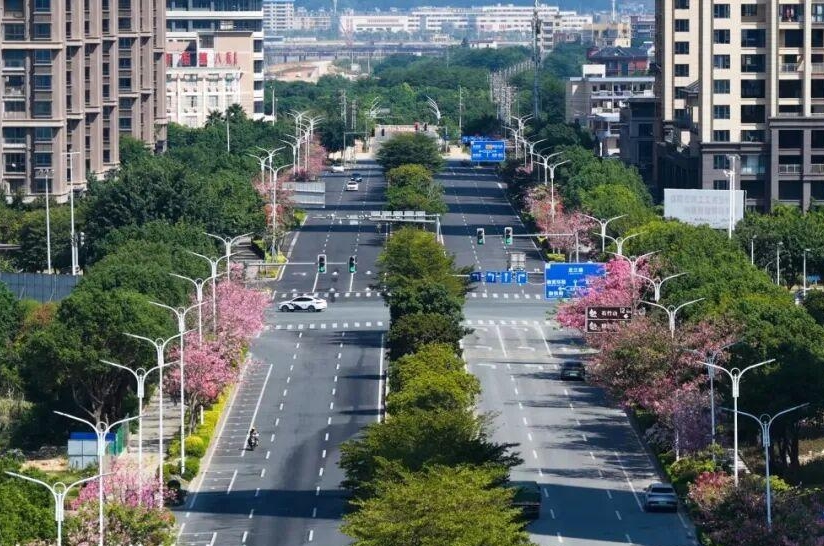 2.迎宾大道:两侧的粉色花树,让日常的通勤路变成了一场视觉享受。