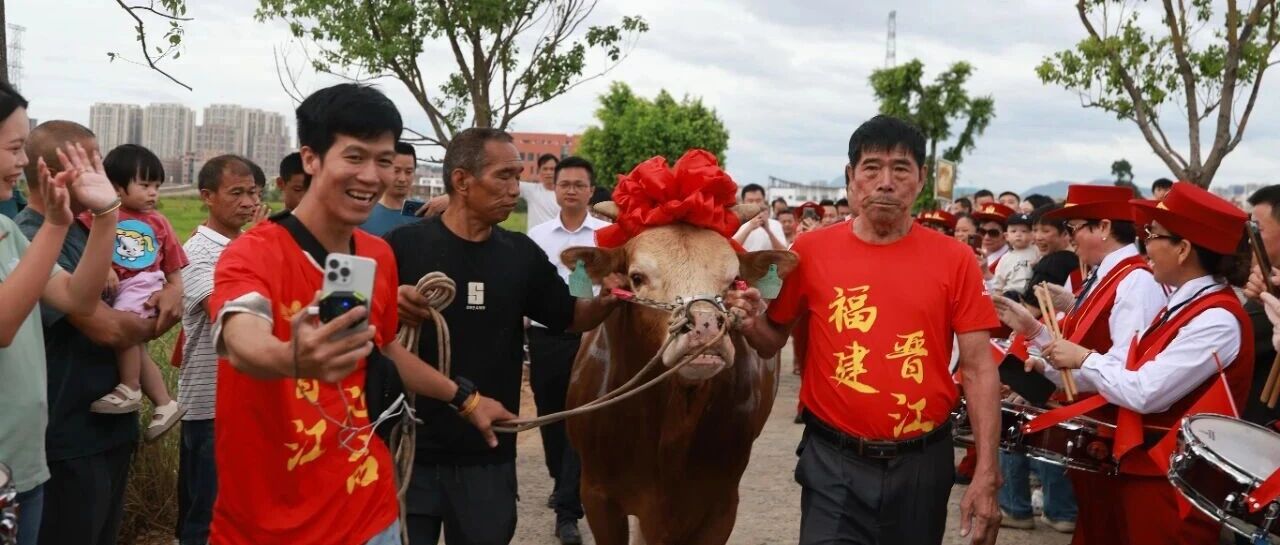 10月19日,在晋江九十九溪,2025“村BA”全国冠军牛正式“落户”,头戴红花、身披特色标识的它一亮相,便吸引众多市民争相举着手机拍照记录。(泉州晚报社融媒体记者 王耿华 摄)