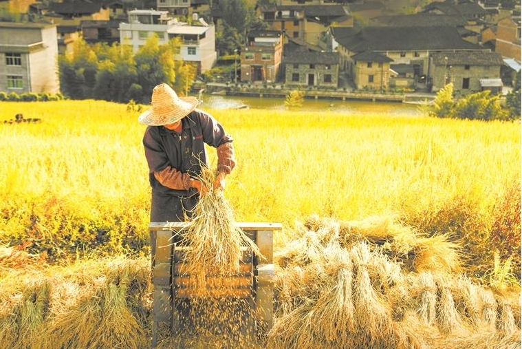 村民打稻谷