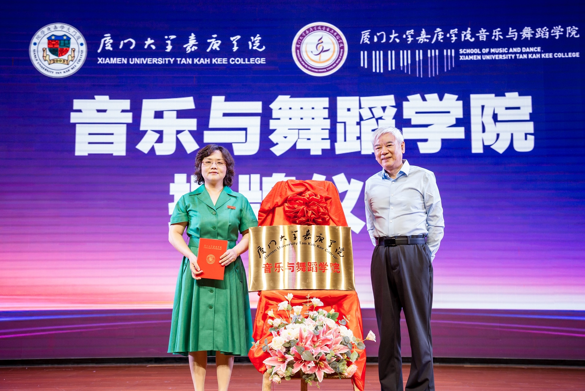嘉庚学院院长王瑞芳(右)为廖瑞洁颁发音乐与舞蹈学院执行院长聘书,并共同为音乐与舞蹈学院揭牌。(朱鲜艳/图)