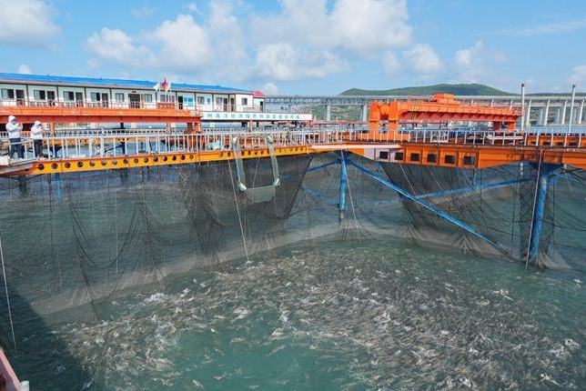 既是升级版本,自有优化之处。“‘航宁2号’的养殖水体要比‘航宁1号’大一倍,我们打了54根桩,更多、更密,可以做到更牢固!”王开木告诉记者,从起网设备到投饵方式,“航宁2号”的智能化、机械化程度都要更胜一筹。“就拿起网来说,夏季高温,网衣容易长藤壶,不及时清理,鱼就会缺氧。所以我们每隔20天左右,会把鱼倒入另一口网箱,拉起整个网晾晒一天进行清理。”这样说来轻巧,可是一口网箱长、宽、深都有25米,网衣规模可想而知,虽有机械辅助,一次起网也要5人同时发力。在“航宁2号”,通过进一步的智能化、机械化,起网一次只需3个人。