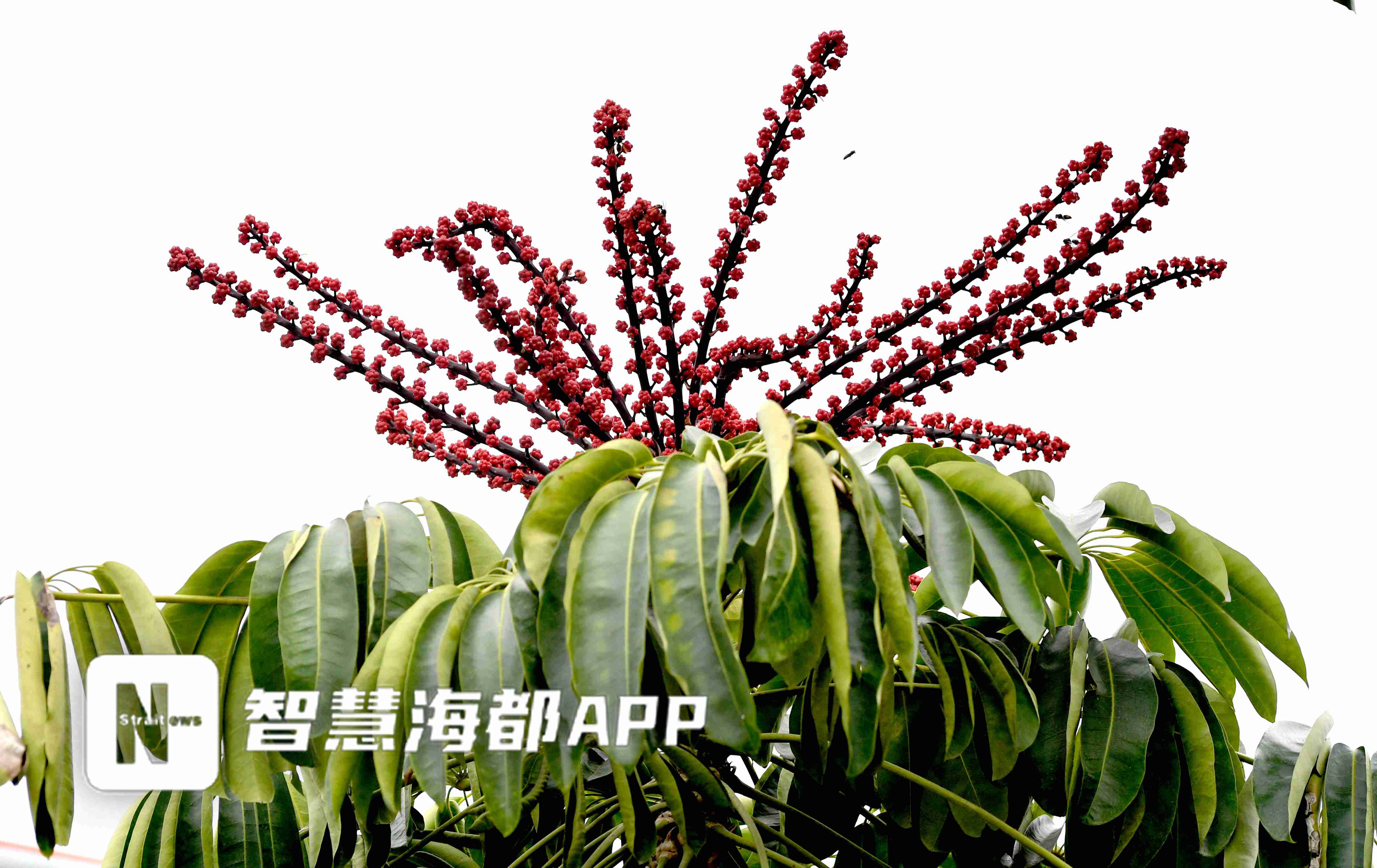 记者现场见到,几棵辐叶鹅掌柴长势旺盛,几十串红花垂坠枝头,“老远就被这抹红吸引了!叶子像把大绿伞,上面挂着红串串,太像冰糖葫芦了。”市民何先生骑电动车路过时,特意驻足拍摄,发朋友圈后引来不少人询问,“在福州住了这么多年,头回见这种串状红花树,新鲜又好看!”