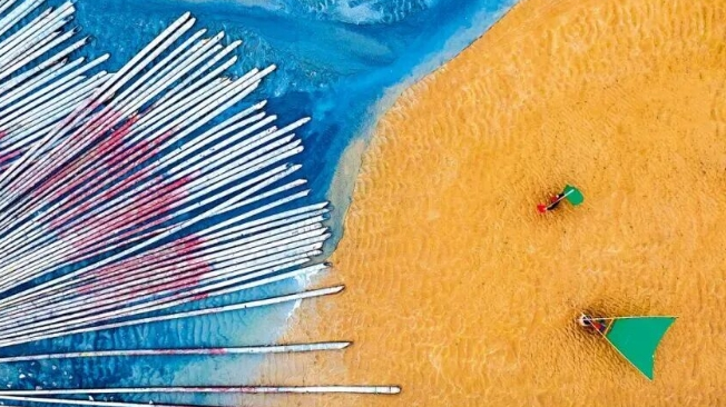 高空视角下,海湾养殖架沿水道蜿蜒成“S”形,渔船穿行时如在蓝色绸带划痕,春季海带晾晒季,翠绿海带与蓝色海水对比强烈,层次感拉满。