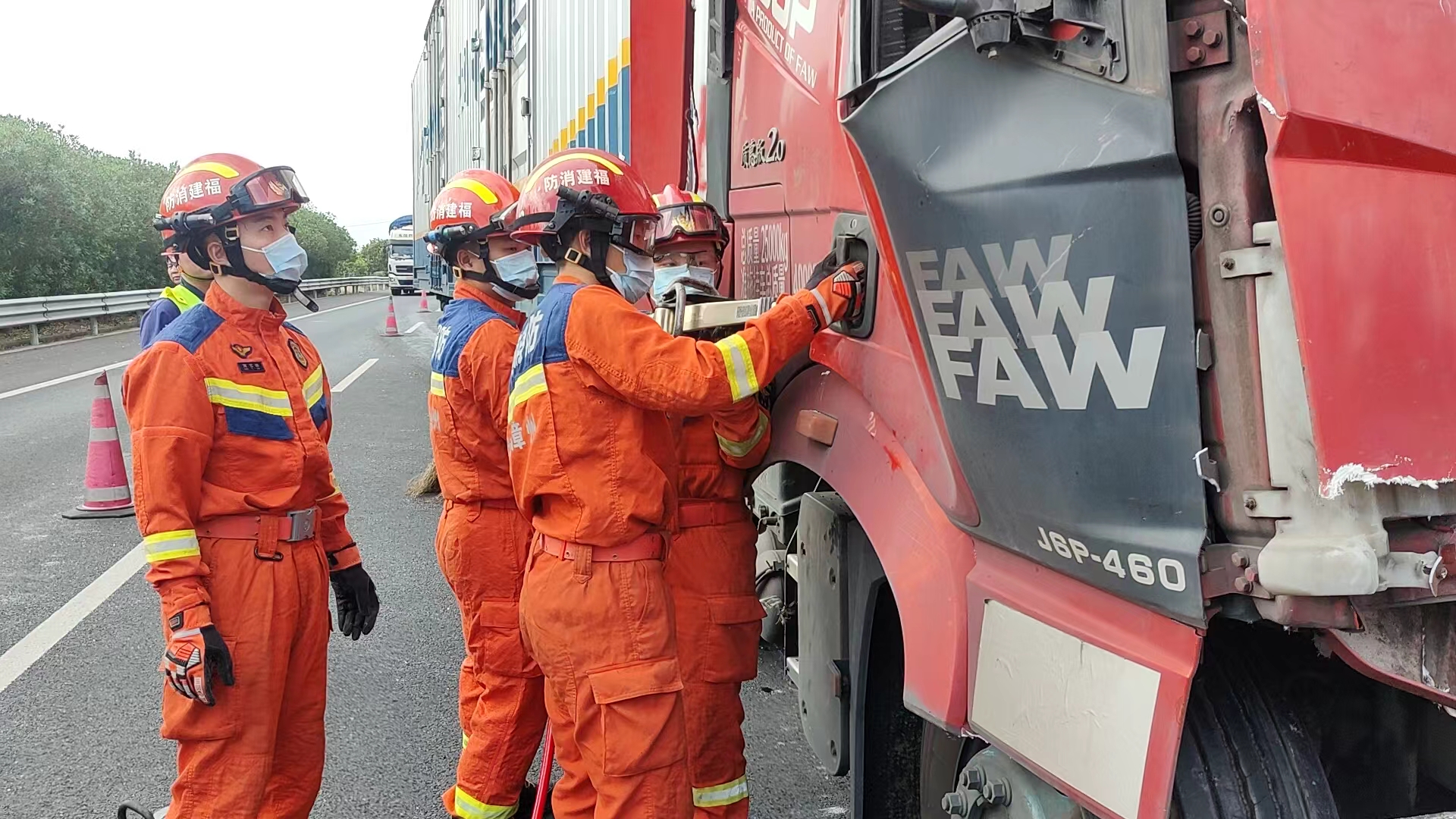 福建日报-新福建客户端10月24日讯(通讯员 林素真 郑达伟)10月24日8时35分,沈海高速漳浦往厦门方向距离天福服务区2公里处发生一起货车追尾事故,后车驾驶员腿部被变形驾驶室卡住无法动弹,情况危急。漳浦县消防救援大队接警后,迅速出动2辆消防车11名消防员赶赴现场处置。