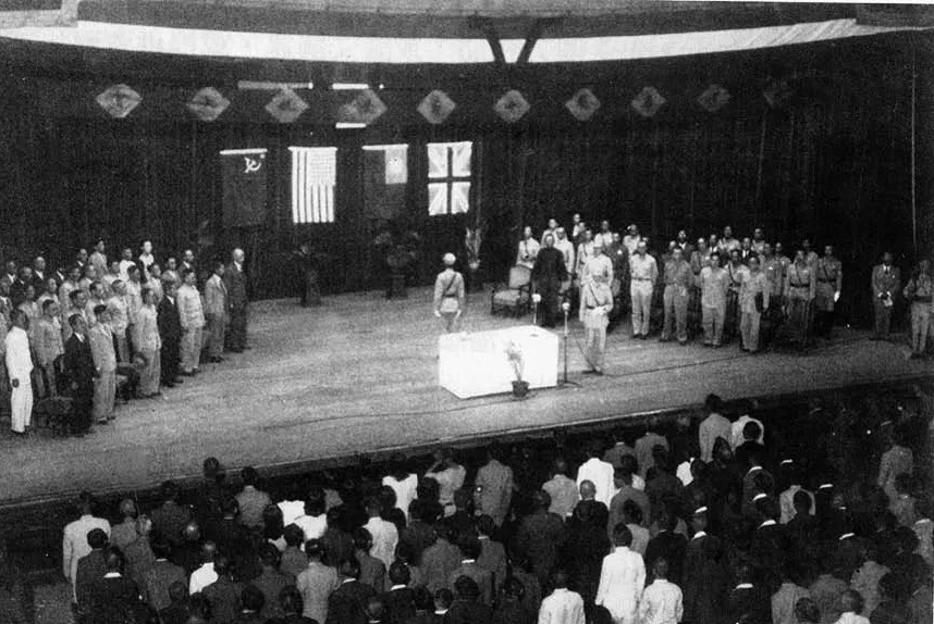 陈仪在台上正式宣布:“从今天起,台湾及澎湖列岛已正式重入中国的版图。”