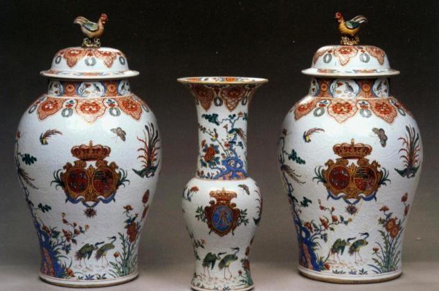 清康熙,景德镇五彩外销纹章瓷将军罐花尊组合,花尊高64厘米,带盖将军罐高75.5厘米,德累斯顿茨温格尔宫博物馆收藏,瓷器编号:PO9053。
