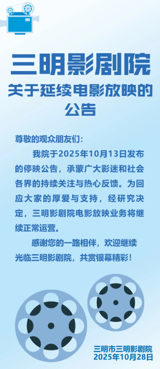 东南网10月28日讯 今天,三明影剧院发布公告,将延续电影放映业务。