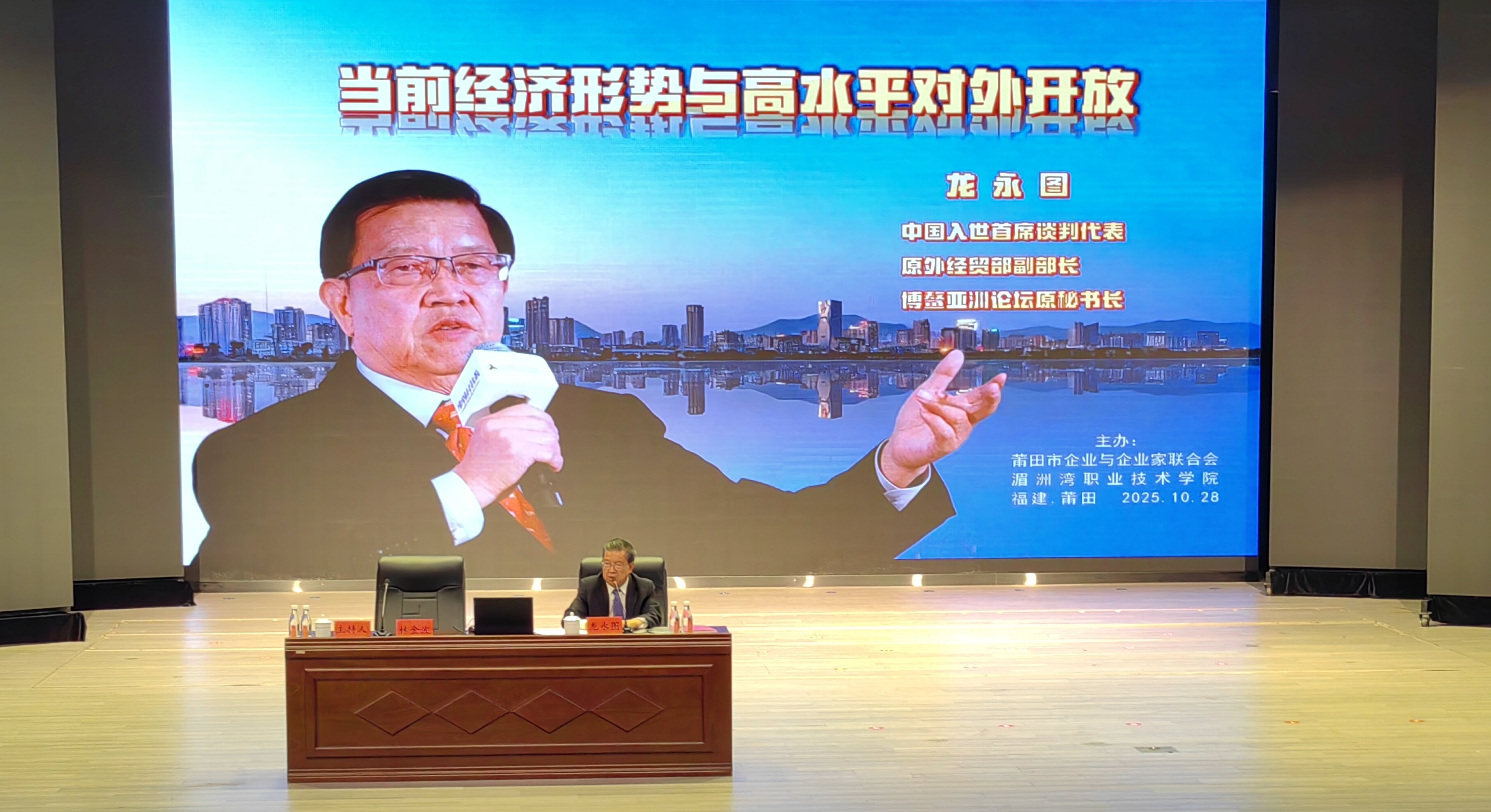 福建日报·新福建客户端 10月28日讯(记者 林爱玲)10月28日上午,应莆田市企业与企业家联合会、湄洲湾职业技术学院、莆田市商务局邀请,龙永图在湄洲湾职业技术学院为当地企业家代表及该校师生代表共计800多人作了主题为“当前经济形势与高水平对外开放”的讲座。