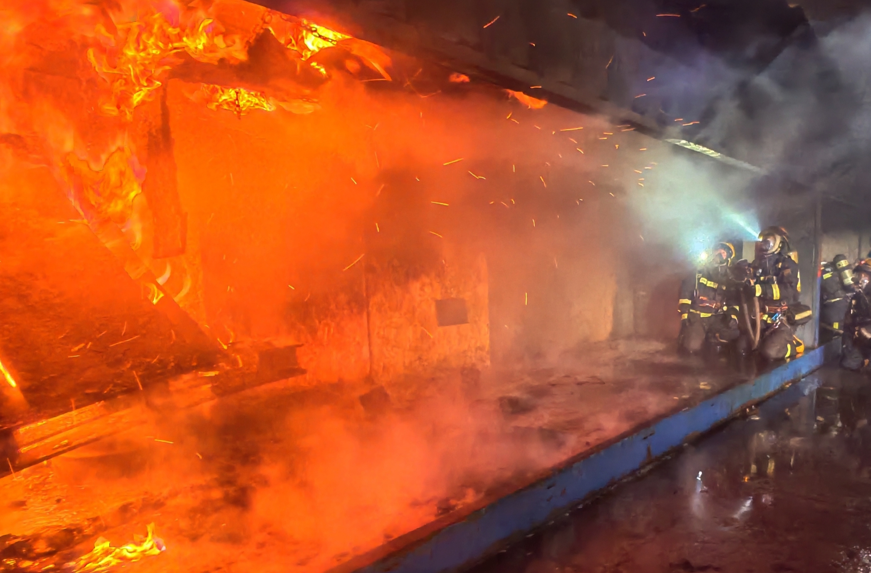 “内攻组出水枪掩护,搜救组随我上!”抵达现场后,指挥员一声令下,全副武装的消防员们如蛟龙入海,深入“火场”,克服夜间作战带来的视线不清、方向难辨等困难,紧密配合,利用热成像仪搜寻并找到“被困者”,上担架固定后成功抢救出"火场”!与此同时,外围多条水龙对“火势”进行精准压制,19点26分明火被补灭。