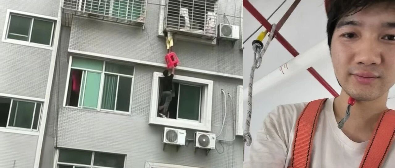 “当时在一楼看小孩时,感觉她不动了,可能是脖子勒住缺氧,我就想着从下方给她往上托举。”黄飞说,因看不清小孩在哪一个房间,他和师傅跑到6楼一个房间一个房间寻找。刚好有一间宿舍没关门,屋内有人,他们立即说明情况。进屋后来到窗边,探头一看上方正是小孩,他随即找来一张红色塑料凳子,自己站在窗台上,左手抓住窗台上沿,右手举着凳子将小孩托举上去。颜强则在旁边拉住他的脚,防止其发生意外。