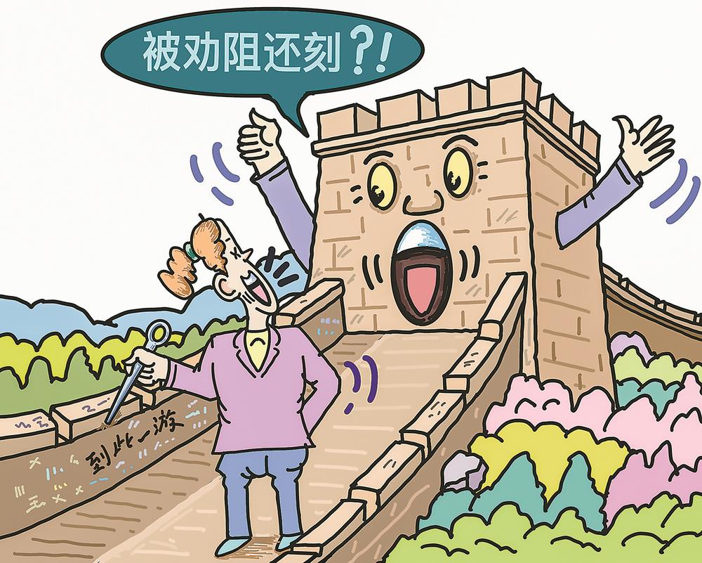 近日,有网友在社交平台发帖称,自己在八达岭长城看到一名女子在城墙上刻字,可上前劝阻后对方仍未停止。帖子发出后,顿时在网上引发热议。保护长城,拦住乱刻乱划的黑手,不能总是拘留罚款这样轻罚了之,必须切实提高长城刻字的违法成本,同时,完善法律法规,细化故意损毁名胜古迹罪的立案标准,对不听劝阻继续我行我素在长城刻字这种情节恶劣的,应对其进行严厉的刑事处罚。唯此,倒逼保护文物意识深入人心,规范游客旅游行为。
