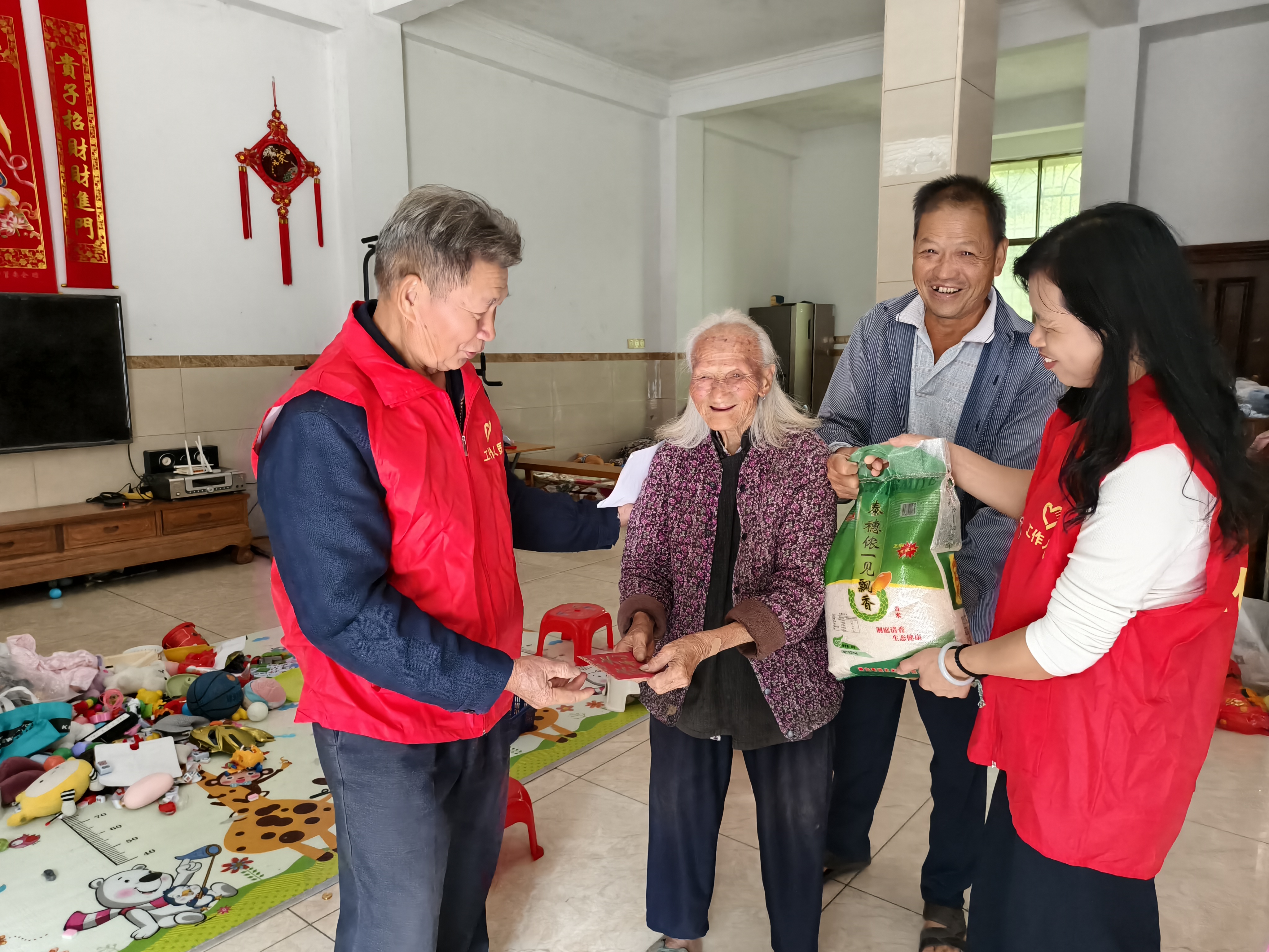 慰问团一行穿梭于村巷之间,逐户登门拜访。在每一位老人家中,黄秀饮书记与乡贤代表们都与长者促膝长谈,嘘寒问暖,仔细询问他们的身体、生活起居和饮食情况,叮嘱他们近期天气转凉,务必注意添衣保暖,保重身体。他们不仅送上了饱含心意的慰问品——优质的大米、醇香的食用油以及满载祝福的慰问金,更送上了党组织与乡贤促进会对老人们健康长寿、生活幸福的美好祝愿。
