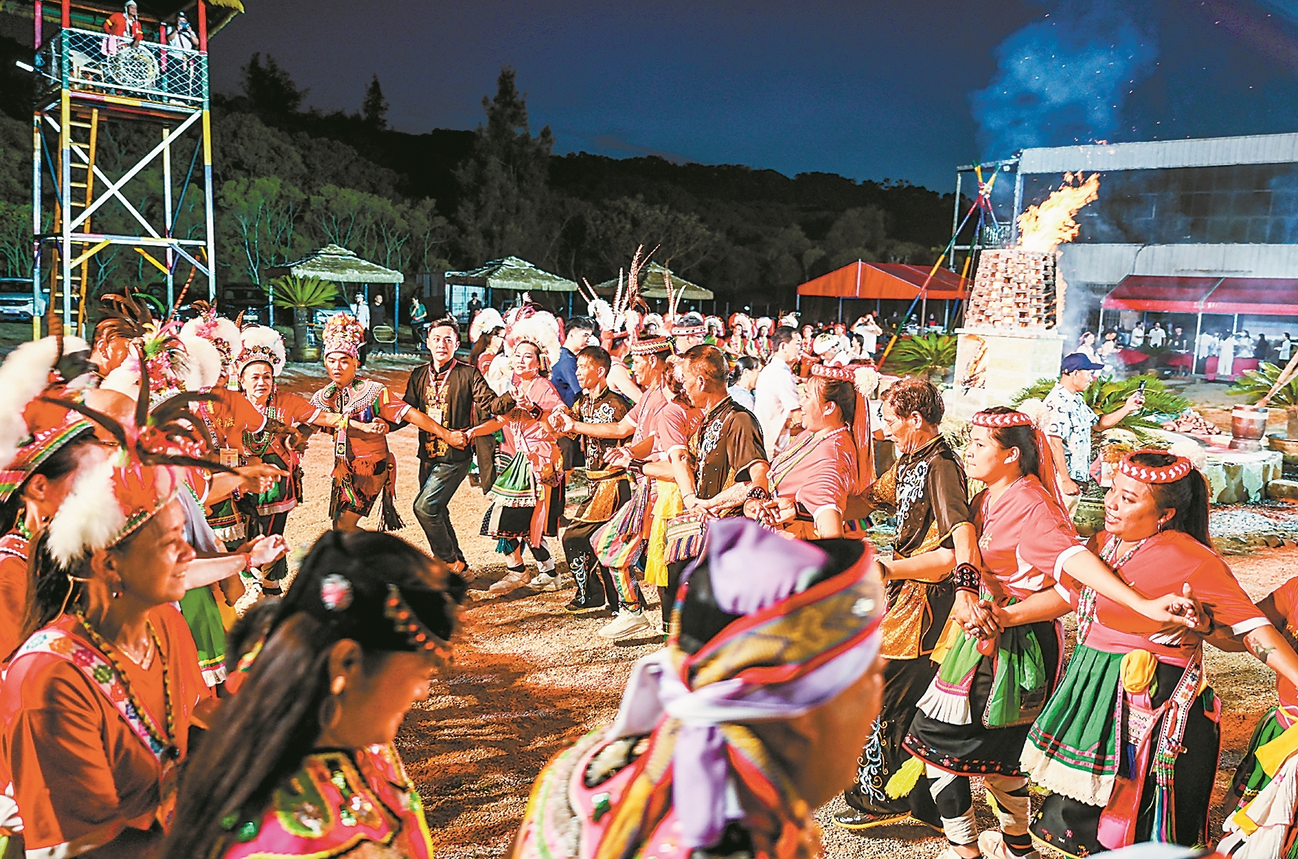 上个月,岚台丰收交流活动现场,南岛舞集舞团成员与台湾阿美同胞载歌载舞、共庆丰收。通讯员 林君斌 摄