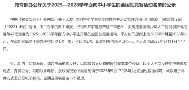 日前,教育部公布了《2025—2028学年面向中小学生的全国性竞赛活动名单》,共有“全国青少年人工智能创新挑战赛”等47项竞赛进入名单。入围竞赛的举办时间原则上为2025年10月至2028年8月,在此期间每学年举办不得超过1次,累计不超过3次。