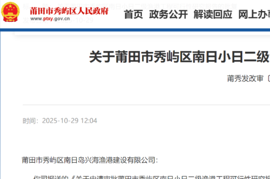 你司报送的《关于申请审批莆田市秀屿区南日小日二级渔港工程可行性研究报告的请示》(秀南政综〔2025〕32号)及相关材料收悉。经研究,现批复如下: