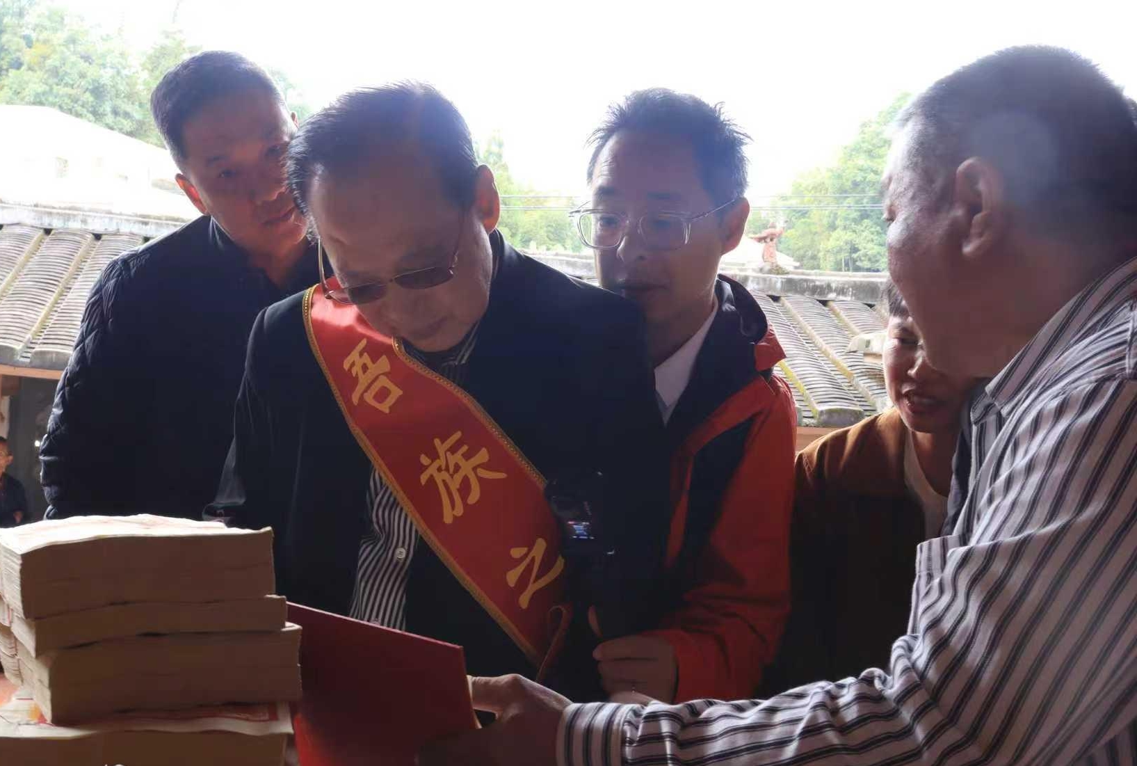 郭正津(左二)在翻阅族谱