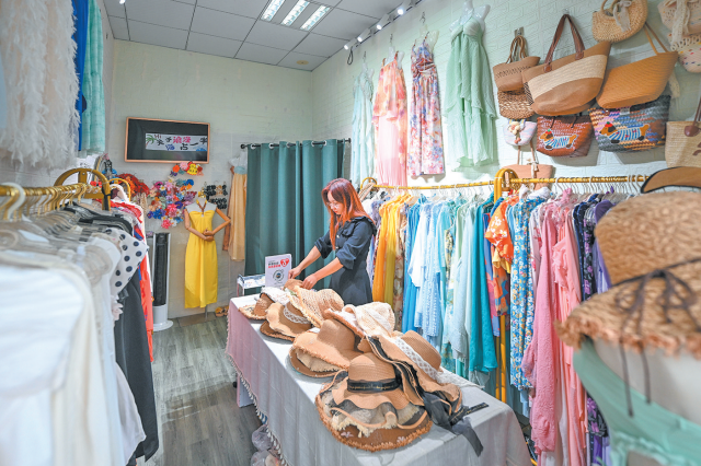 店铺主理人郭雅云介绍,店内服饰以海边度假穿搭风格为主,目前有五百多套,后续还会根据潮流趋势不断添加新款。所有服饰都实行一客一洗一消毒,确保卫生安全。