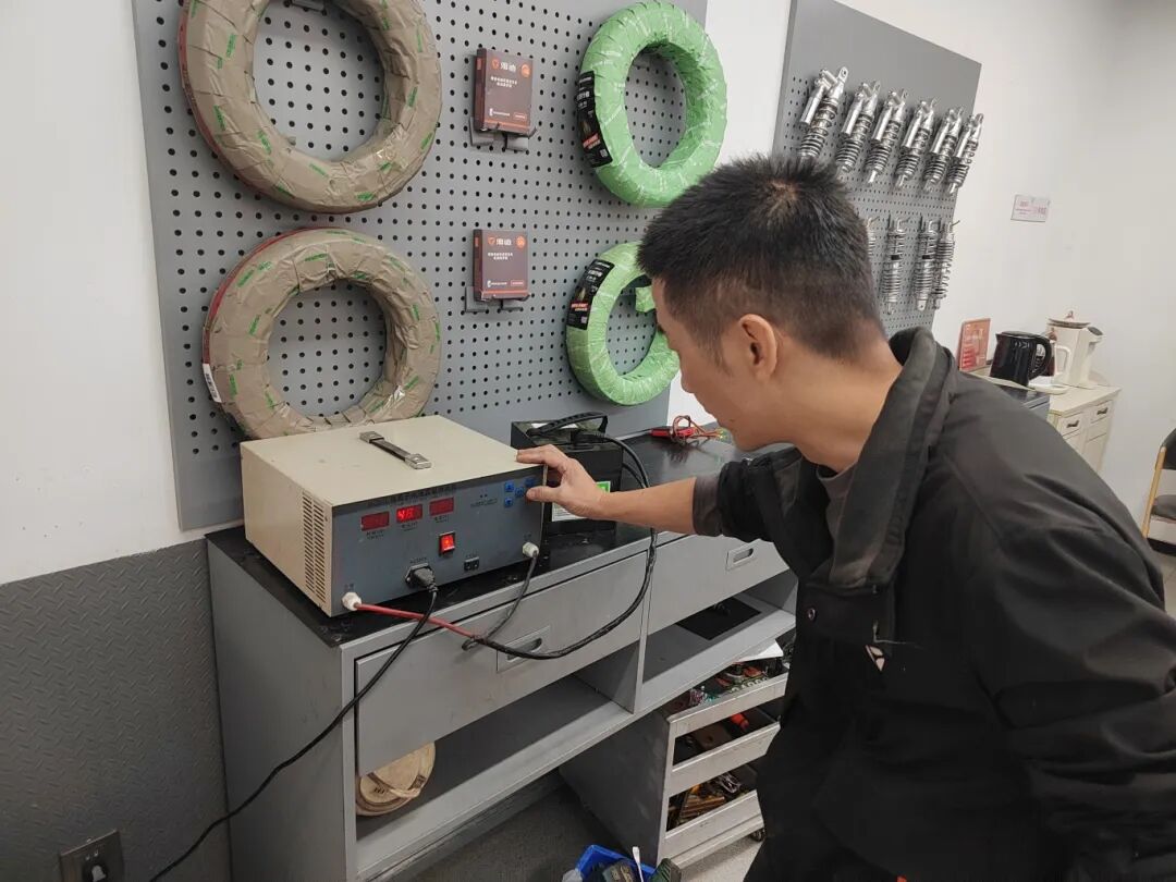 蔡先生小心地取下赵女士电动车的电池,首先观察外观是否存在鼓包、破损,标签上生产信息是否完整。随后,拿出检测仪器,接上电源。因为电池的容量与电压需要通过专业电子测试仪精准读取。
