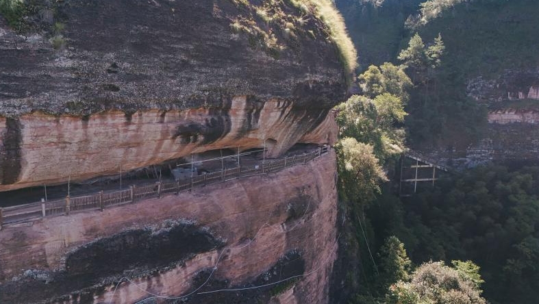 目光所及,是那道横亘于崖壁的“中国最长丹霞岩槽”。亿万年地质运动的伟力,在此凝固成一道沉默而磅礴的风景。