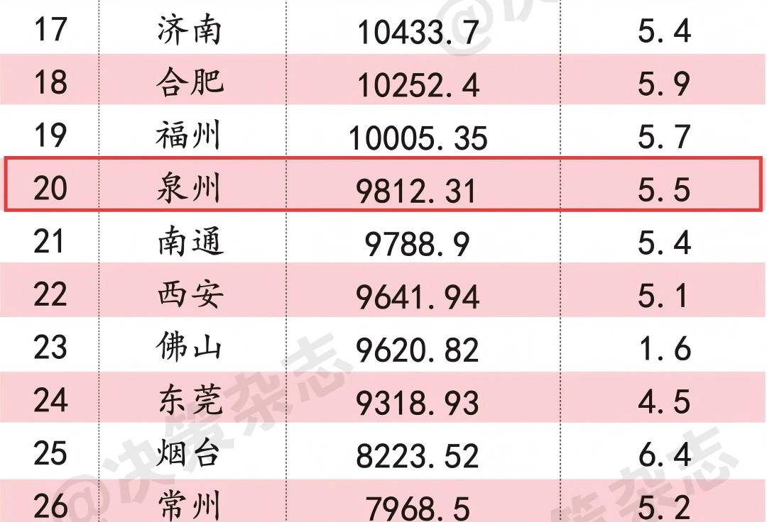 与2025年上半年相比,头部城市格局保持稳定,中后段位次争夺激烈。据《第一财经》报道,泉州市前三季度GDP9812.31亿元,同比增长5.5%,排名跃升3位,成为最大“黑马”;合肥上升2位;长沙、唐山、徐州各提升1个位次。