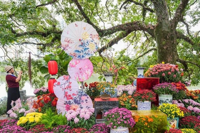 在“双龙戏珠”的另一侧,菊展团队在月季亭前打造了“菊韵华章”展点。记者现场看到,造景菊花的花色以红、黄、粉为主,融合油纸伞、瓷器等元素,呈现色彩浓烈、造型磅礴的视觉张力,传递自然美与艺术美交融的魅力。