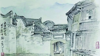 回到住处后,我凭借记忆在宣纸上勾勒出小巷里的风景。错落的线条组合成别具韵味的民居建筑,与天空、墙面的留白形成疏密对比。在色彩的运用上,我仅以淡淡的蓝色和绿色晕染画面,以营造清新淡雅的意境。最终,这幅《东源乡古宅》为我留住了那份难忘而美好的记忆。
