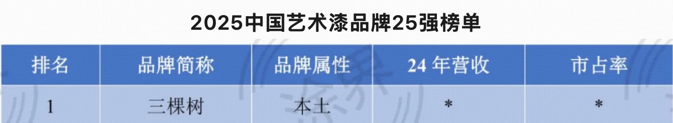 近日,行业权威媒体《涂界》正式发布“2025中国艺术漆品牌25强榜单”。凭借卓越的市场表现,三棵树得到了广大消费者与行业专家的高度认可,荣登榜首,这充分体现了其艺术漆产品实力与品牌价值,并印证了中国品牌在国内艺术漆领域的主导地位。