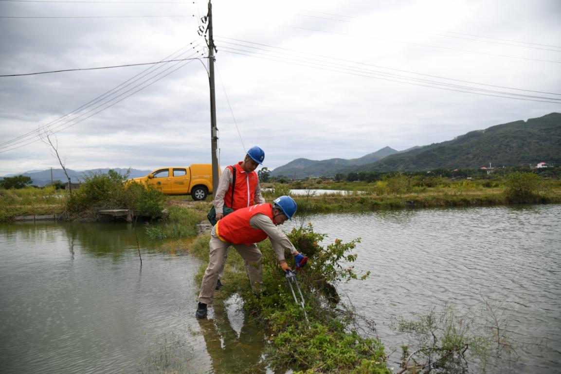 11月11日,国网云霄县供电公司组织辖区东厦镇供电所员工采用“人巡+机巡”相结合的方式,对东方埭一带养殖池边土质较为松软的配电线路进行特巡,细致查看电杆有无倾斜,杆基、拉线是否需要加固处理。