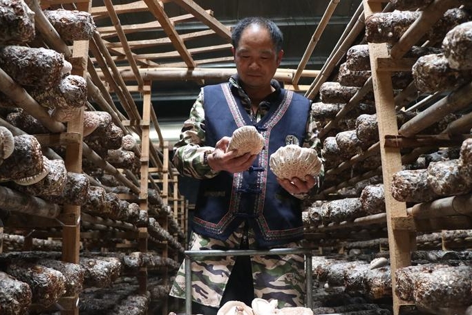 川边村菇农雷兴福在采摘香菇。(霍口畲族乡供图)