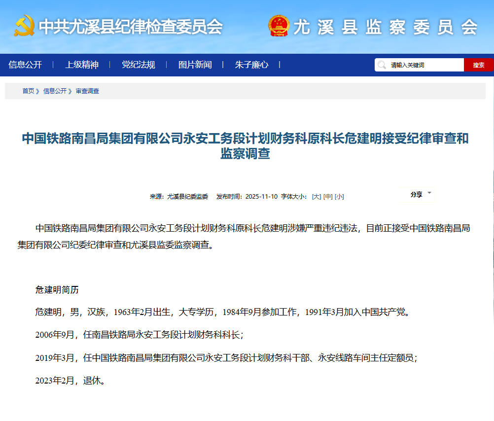 中国铁路南昌局集团有限公司永安工务段计划财务科原科长危建明涉嫌严重违纪违法,目前正接受中国铁路南昌局集团有限公司纪委纪律审查和尤溪县监委监察调查。