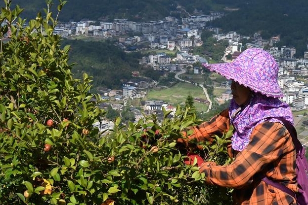 近日,闽侯县洋里乡绅带村的近700亩油茶林迎来了丰收,漫山遍野的油茶树挂满了沉甸甸的果实。鲜为人知的是,20年前的这里还是无人问津的荒山。