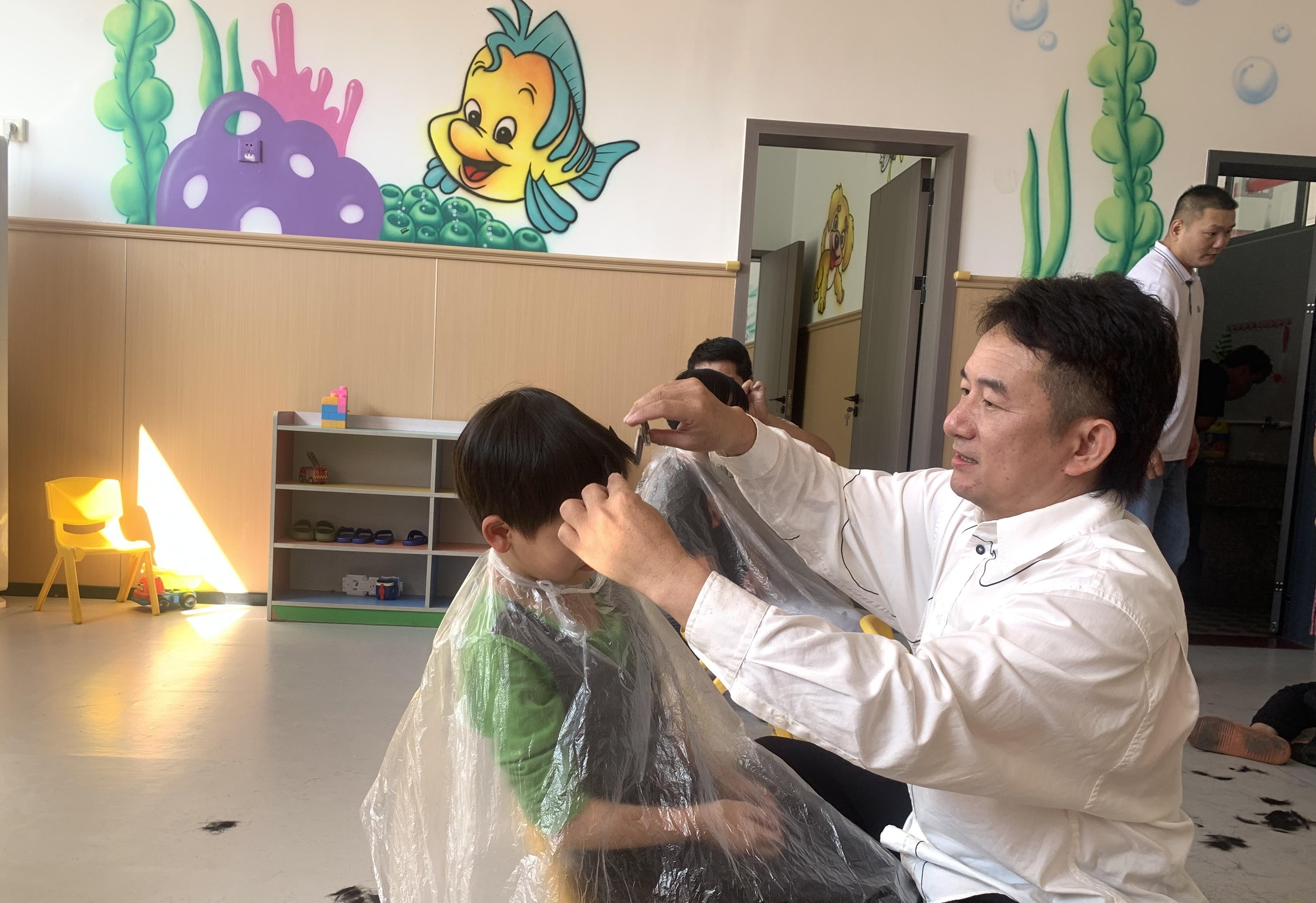 义剪当天上午,儿童福利院二楼的活动室里充满了温馨的氛围。孩子们在工作人员的带领下,等待着他们的“老朋友”。王国庆和员工们熟练地取出工具,一手推子,一手剪刀,动作轻柔而专注。