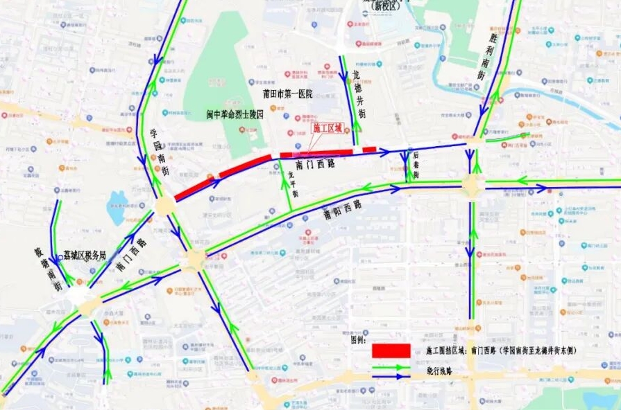 二、管制要求:南门西路(学园南街-龙德井街)路段实行半幅封闭施工,车辆行人需绕行。请广大市民提前安排好出行方式和线路,并根据路段路口周边设置的交通标志指示提前绕行。
